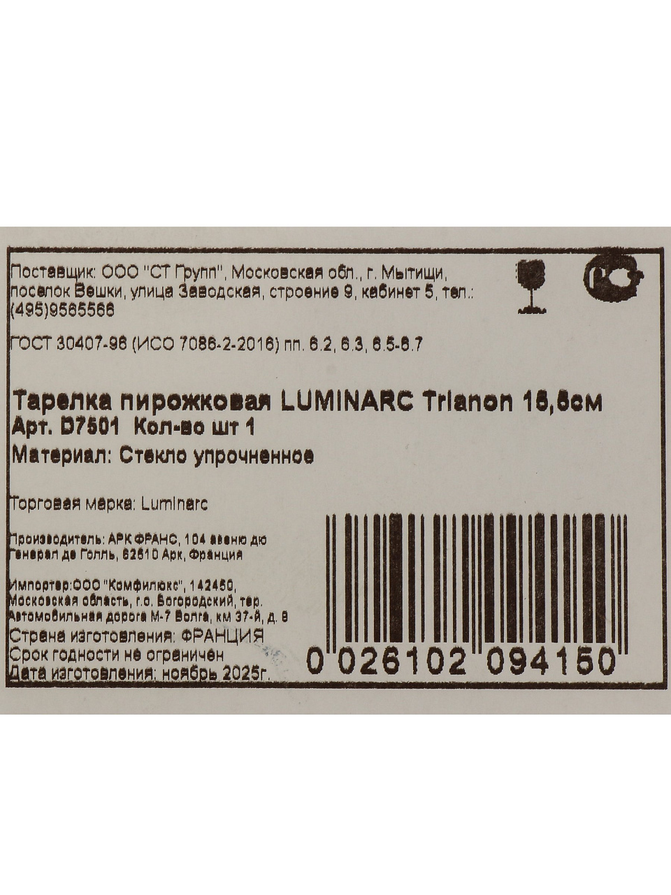 Тарелка пирожковая, стеклокерамика, 15.5 см, круглая, Trianon, Luminarc, D7501
