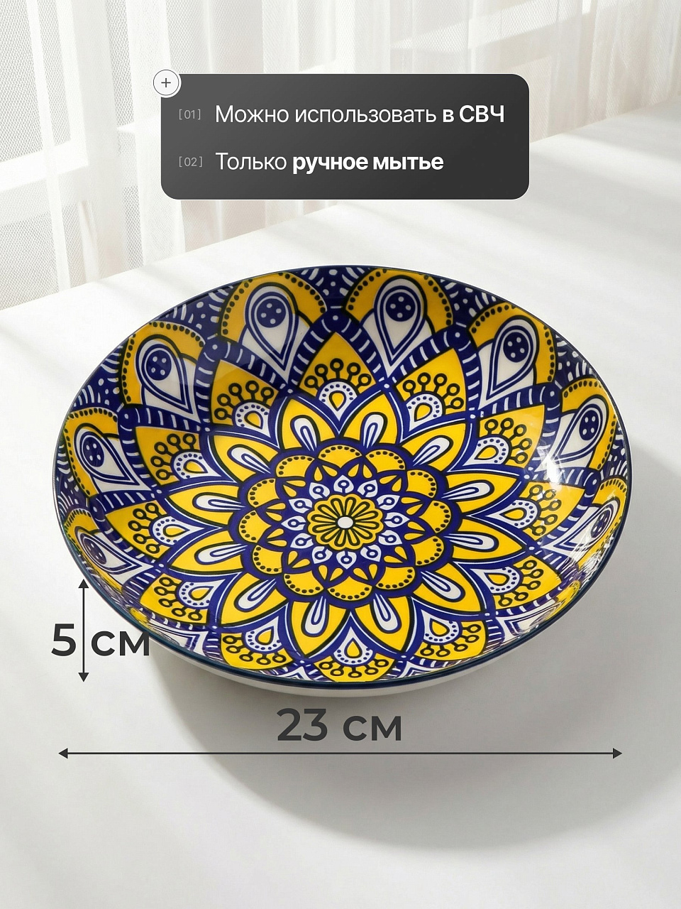 Обеденная керамическая тарелка Мантра диаметром 23 см — это сочетание эстетики восточного орнамента и функциональности. Благодаря прочной керамике, изделие выдерживает ежедневное использование, сохраняя насыщенный синий цвет и рисунок. Для тех, кто ищет, какую тарелку выбрать для сервировки или как выбрать керамическую посуду для дачи, модель Y6-6016 станет оптимальным решением: ее удобно использовать для горячих и холодных блюд, а также разогревать пищу в СВЧ.