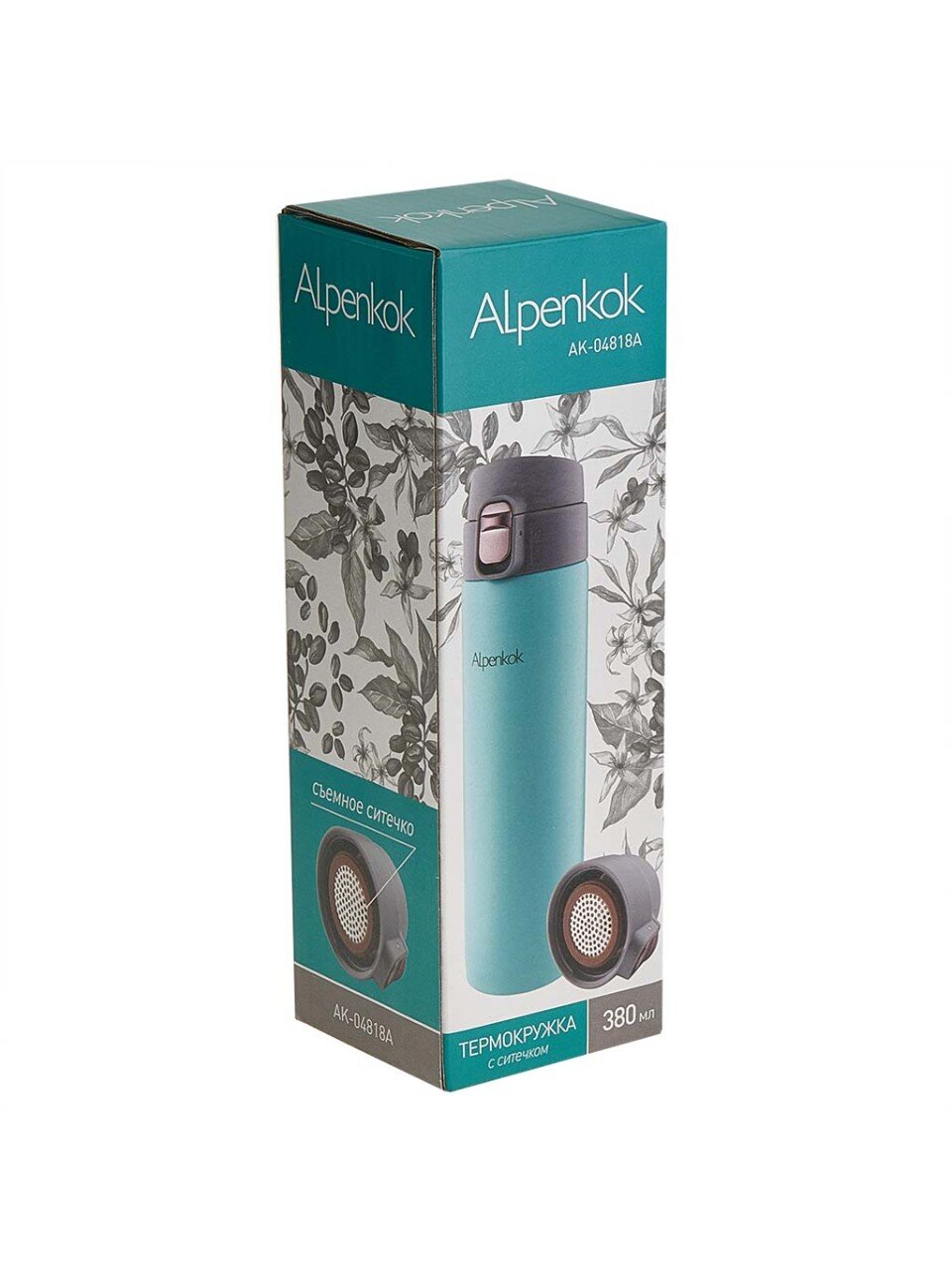 Термокружка нержавеющая сталь, 0.38 л, Alpenkok, колба нержавеющая сталь, с ситечком, вакуумная, бирюзовая, AK-04818A