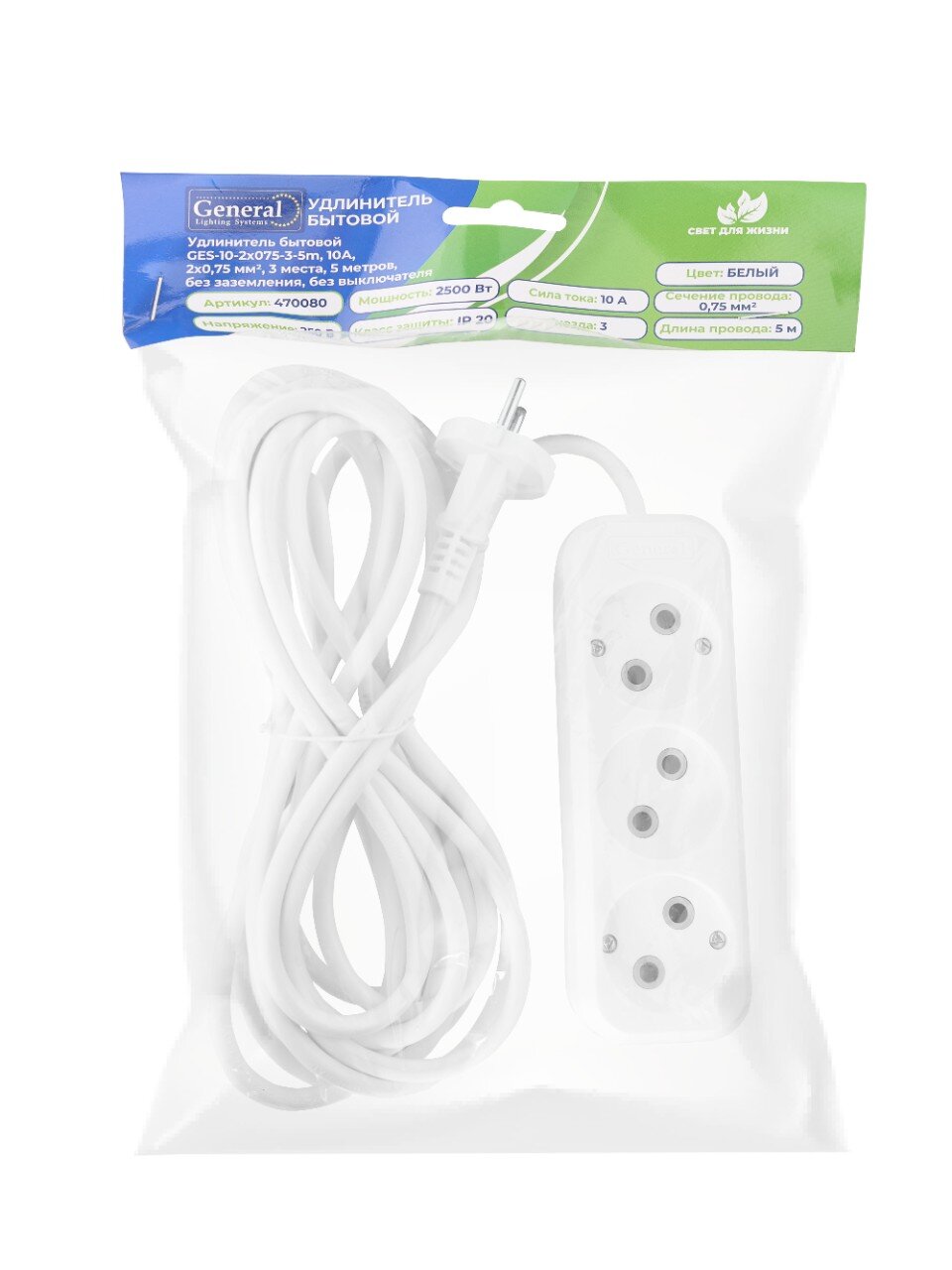 Вы можете приобрести «Удлинитель бытовой 3 гнезда, 5 м, ПВС, 2х0.75 мм², без заземления, 10 А, 2200 Вт, General Lighting Systems, 470080» и другие товары в нашем интернет-магазине в Смоленске по низким ценам и с бесплатным самовывозом.