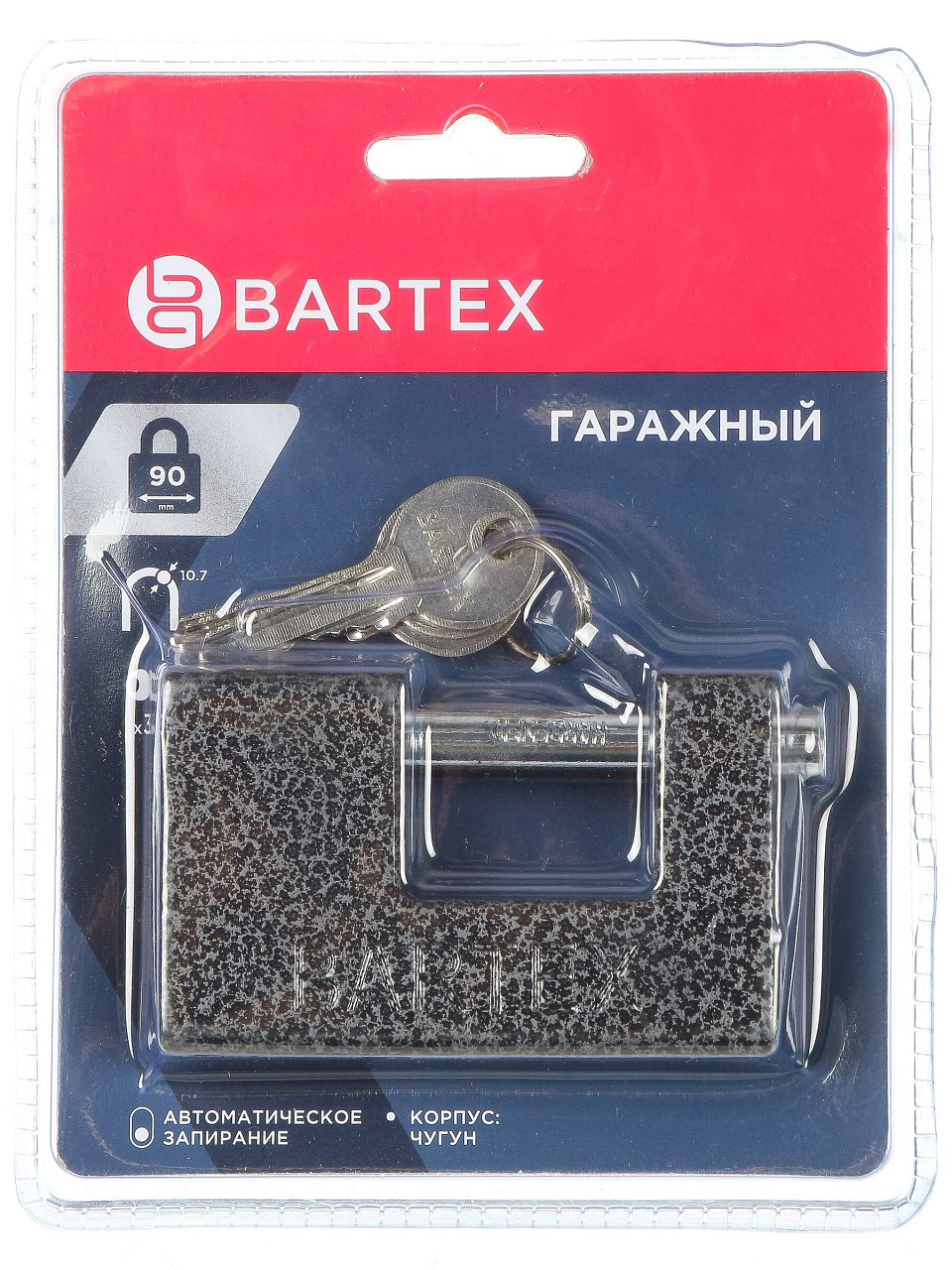Замок навесной BARTEX чугунный 90мм Гаражный, блистер, 3 ключа, 504665